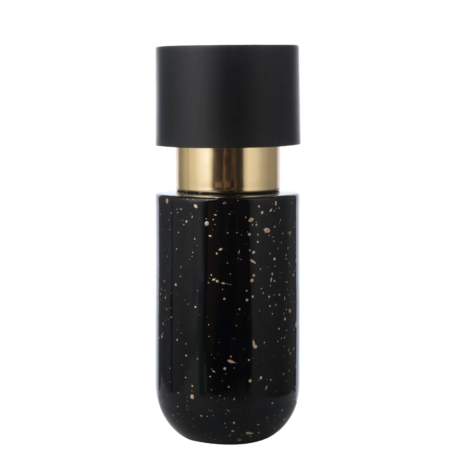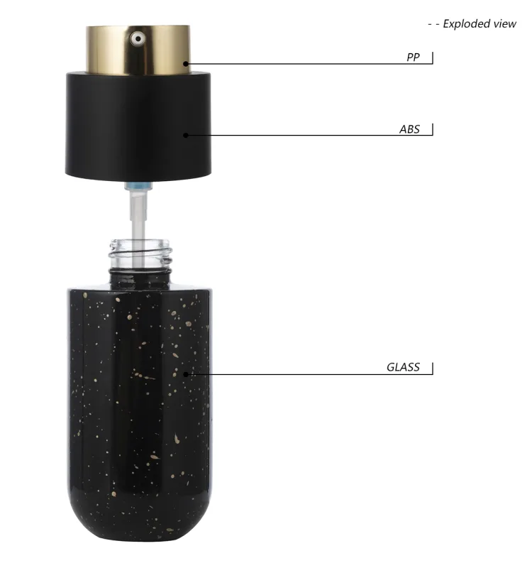 This glass pump bottle features a stylish cylinder design,It has a deep black body with a gold spray nozzle, exuding a sense of luxury. The surface has a unique spray effect, adding personality and charm.