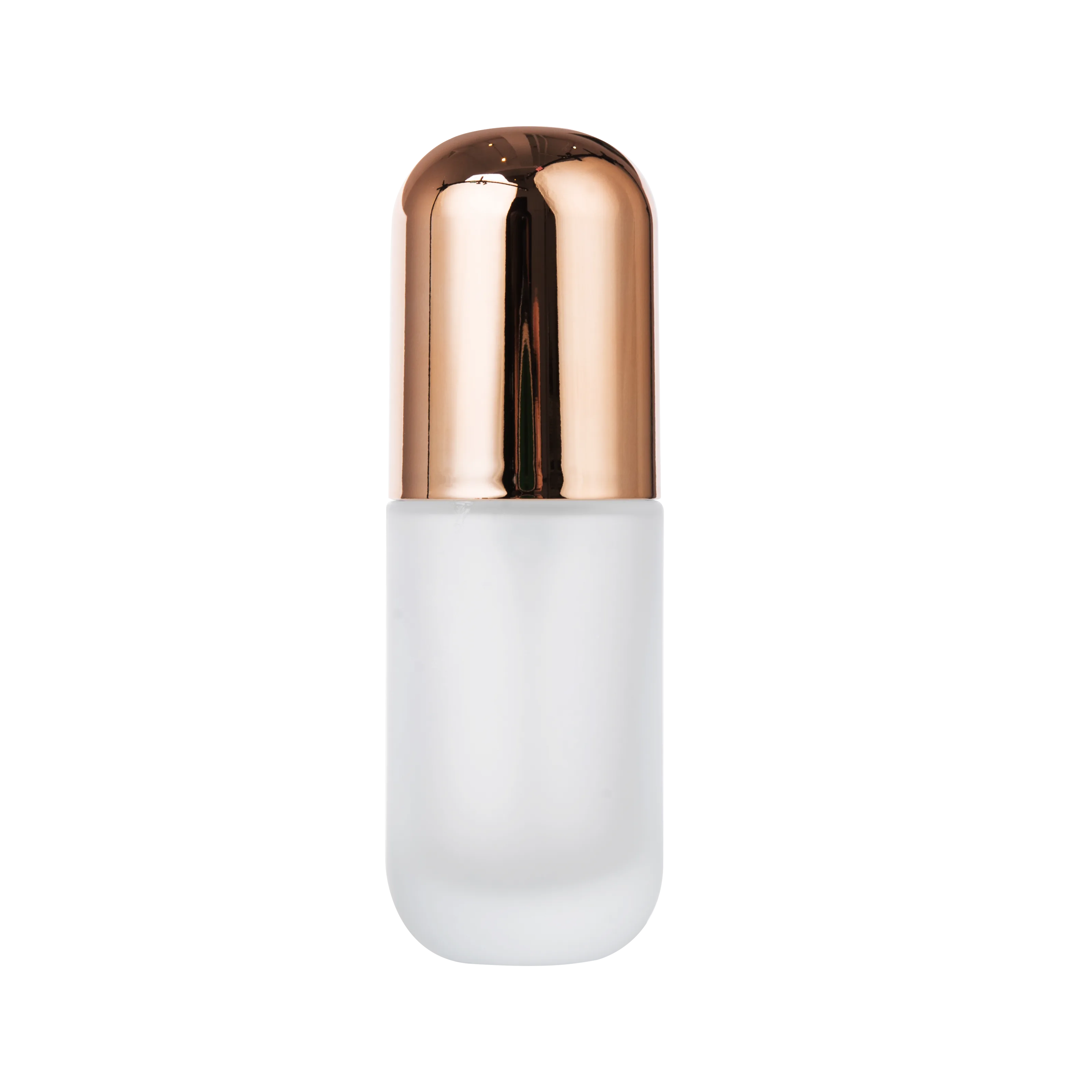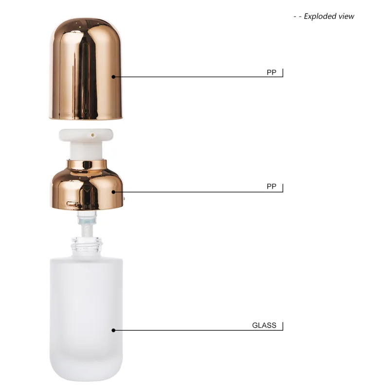 This is a lightly luxury cylinder glass pump bottle with a frosted finish and a rose gold lid, blending practicality with aesthetics.