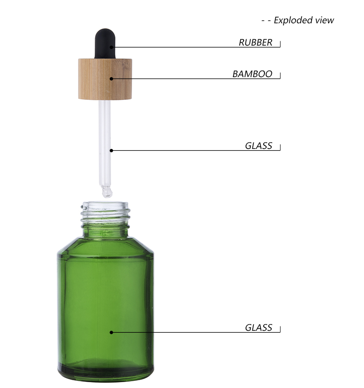 Sloping shoulders glass droppers with the green color,The pipette is straight with a round shaped tip and either a bamboo collar,They are widely chosen by brands looking for an eco-friendly look.