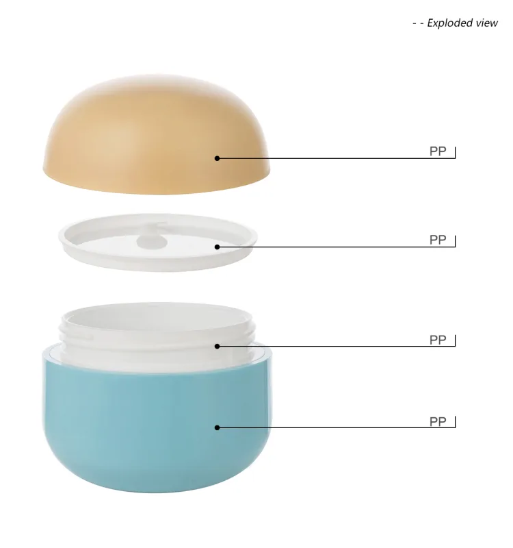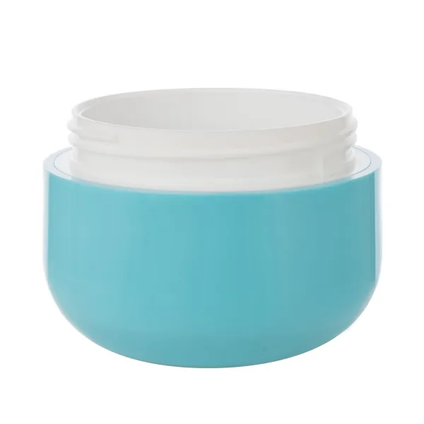 This cream jar stands out with its unique design. It has a soft beige top and a fresh blue bottom that create a striking contrast. This makes it visually appealing. The rounded shape is attractive and easy to grip. It enhances the user experience.