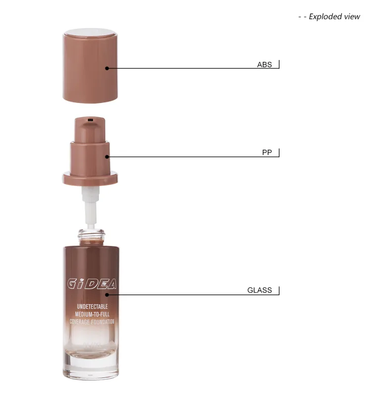 The bottle has an elegant gradient design, a durable glass body, a stylish ABS cap, and a precise PP pump. This ensures the product formula is well preserved and keeps its effectiveness. It shows a commitment to sustainability and is a good choice for eco-friendly packaging. It works for foundation or other cosmetics and can be customized for brand needs.