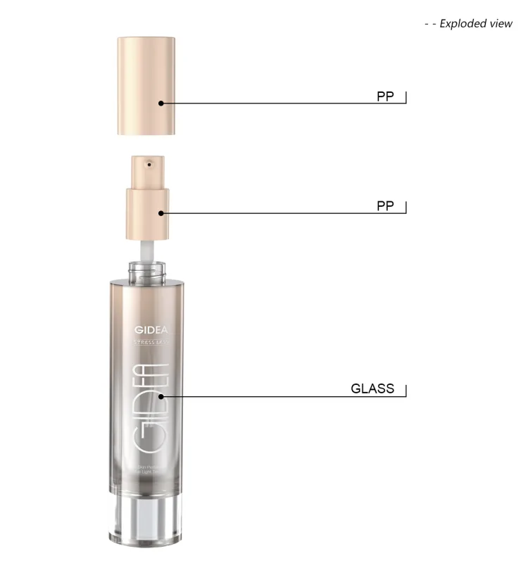 The design features a light luxury aesthetic with a cylinder glass body paired with a gold-plated PP pump. It is simple, elegant, and easy to carry. The glass shows the clean quality of the contents.