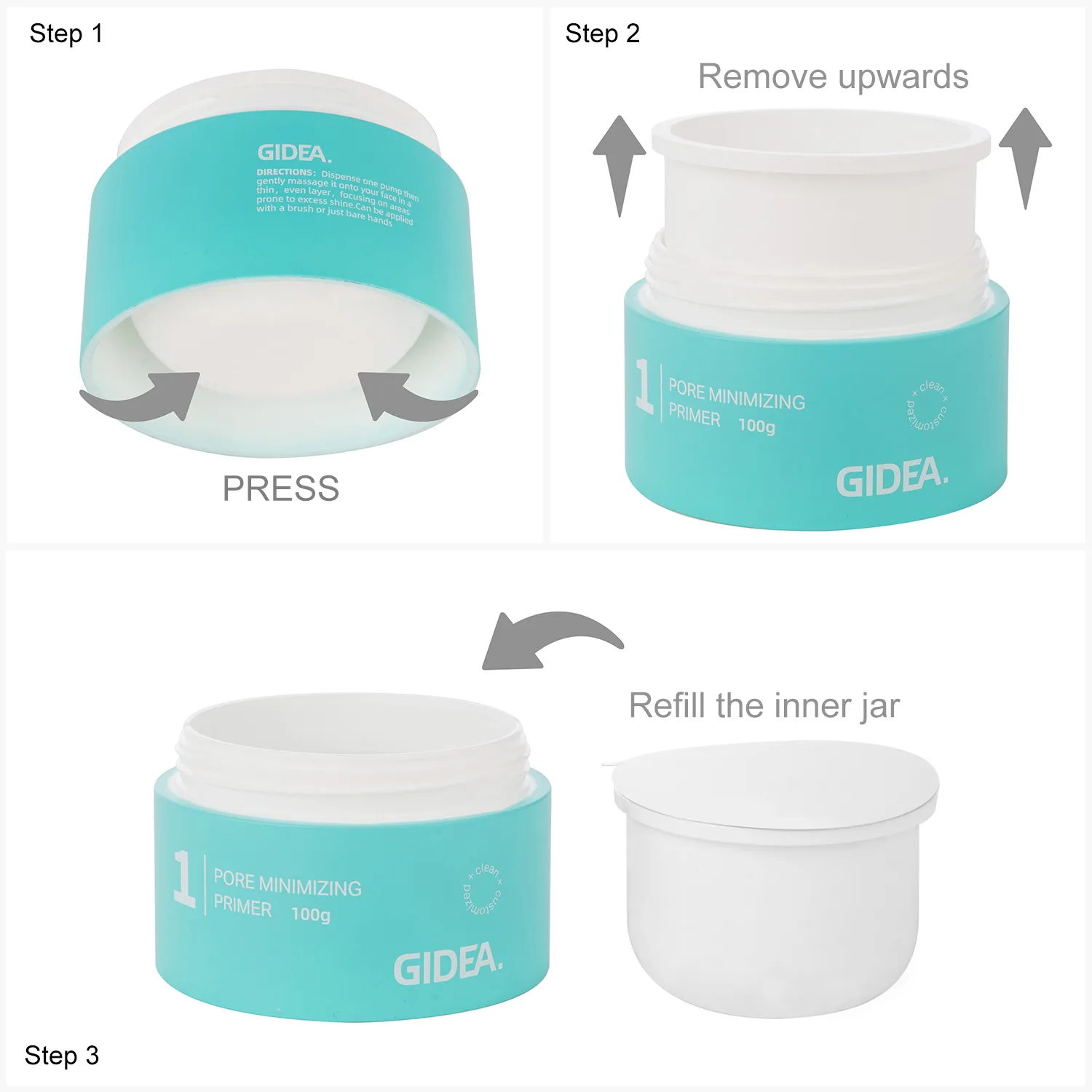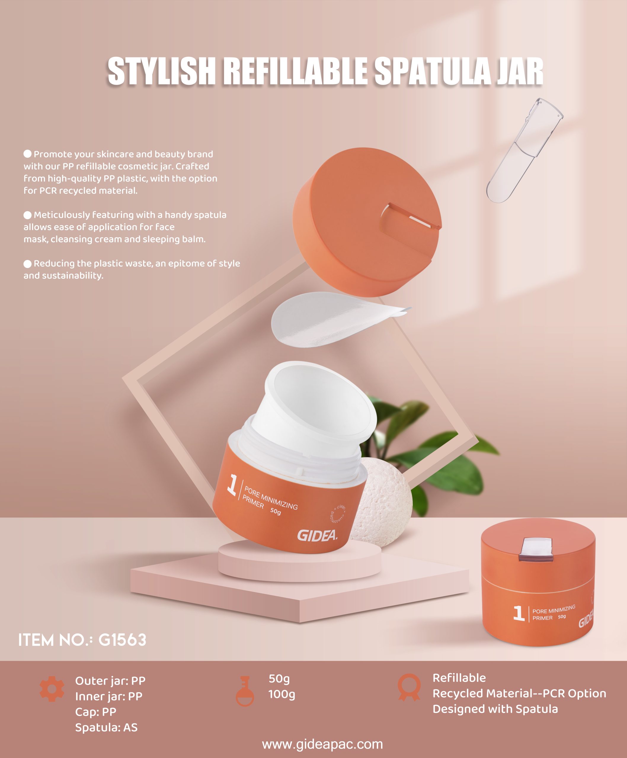 This jar is made from all PP material. Resonable price and easy for recycling. This is a container that has a refillable function. A spatula on the cap which can can refuce the direct contact with formula. Perfect for facial cream. Color, Finish, and Print: Customized color and printing are available,such as frosty, matte, semi-gloss,silkscreen printing and hot stamping.