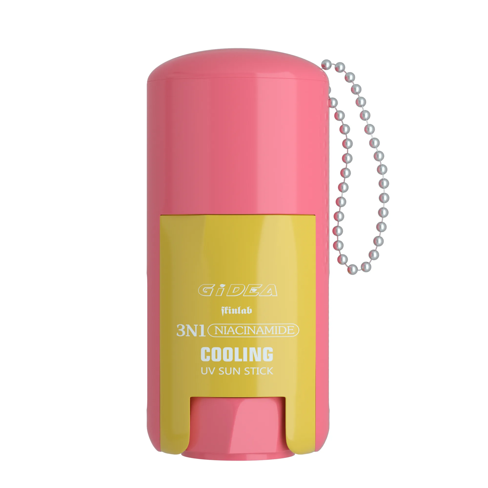 This vibrant stick container has a pink and yellow color scheme and a cylindrical shape. It is made for style and function. It includes a small chain that lets you attach it to bags or keychains for easy access. The stick format gives you a precise and clean application. It is good for sun protection on the go.