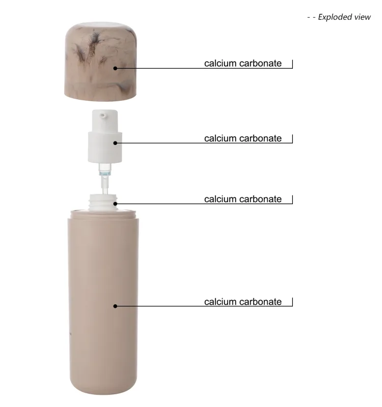 This lotion bottle is made from biodegradable calcium carbonate (CaCO3). It focuses on durability, elegance, and reducing environmental impact. This CaCO3 blend reduces plastic usage by over 70%. It also provides a smooth, stone-like texture. This gives a premium feel and enhances your brand’s natural vibe.