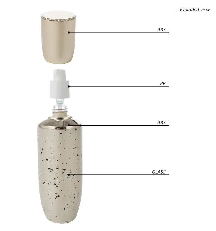 This glass pump bottle stands out with its unique design and high-quality materials. The glass body has an elegant mixed color scheme with a splatter effect. The gold pump head is attractive and ensures a smooth user experience.