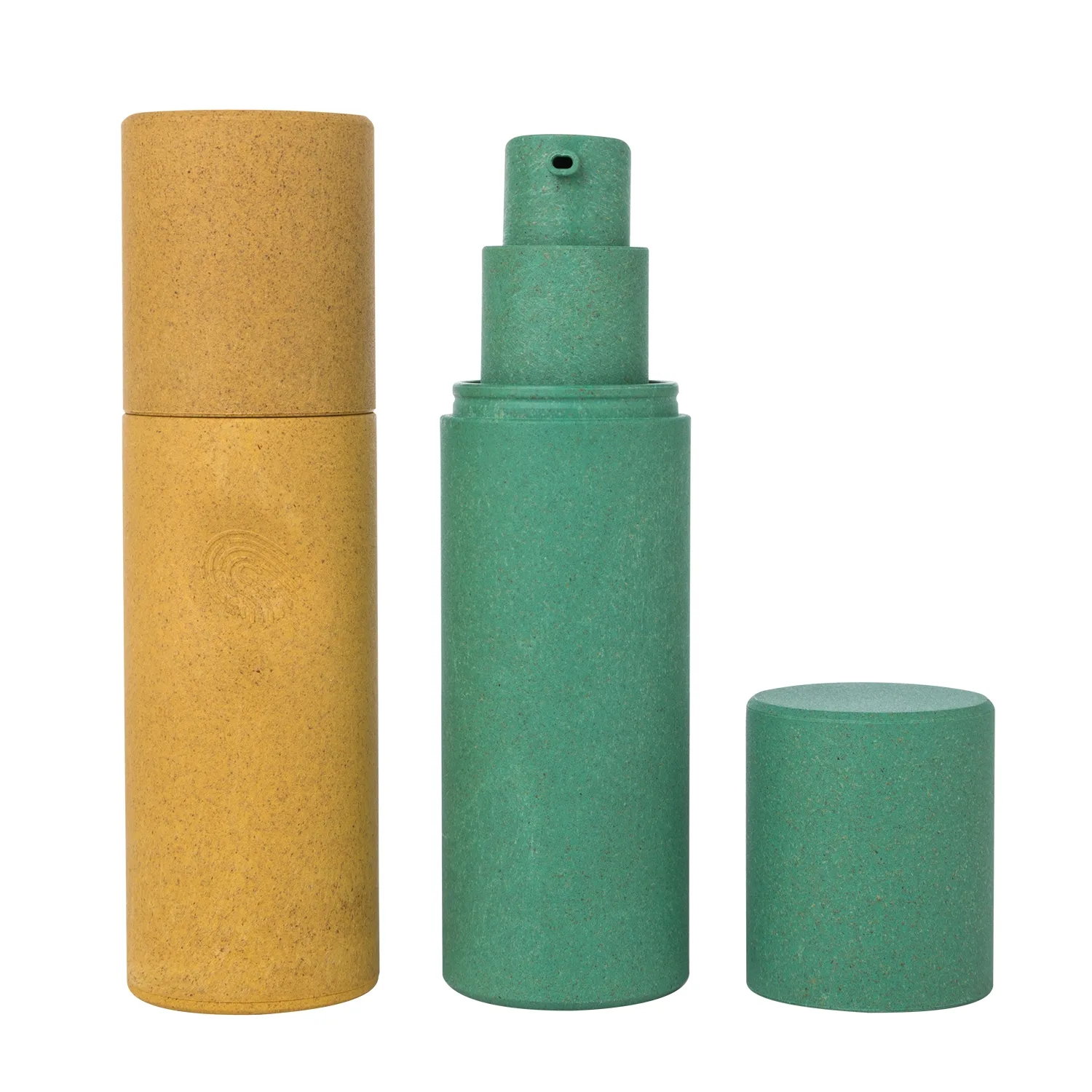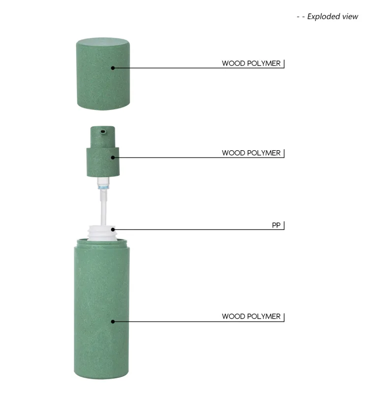 The cylinder green lotion bottle, made of wood polymer and PP, is in line with the current environmental principles. The bottle as a whole is clean and pure, the inner bottle can be replaced, which is very suitable for the brand packaging of natural skin care products.