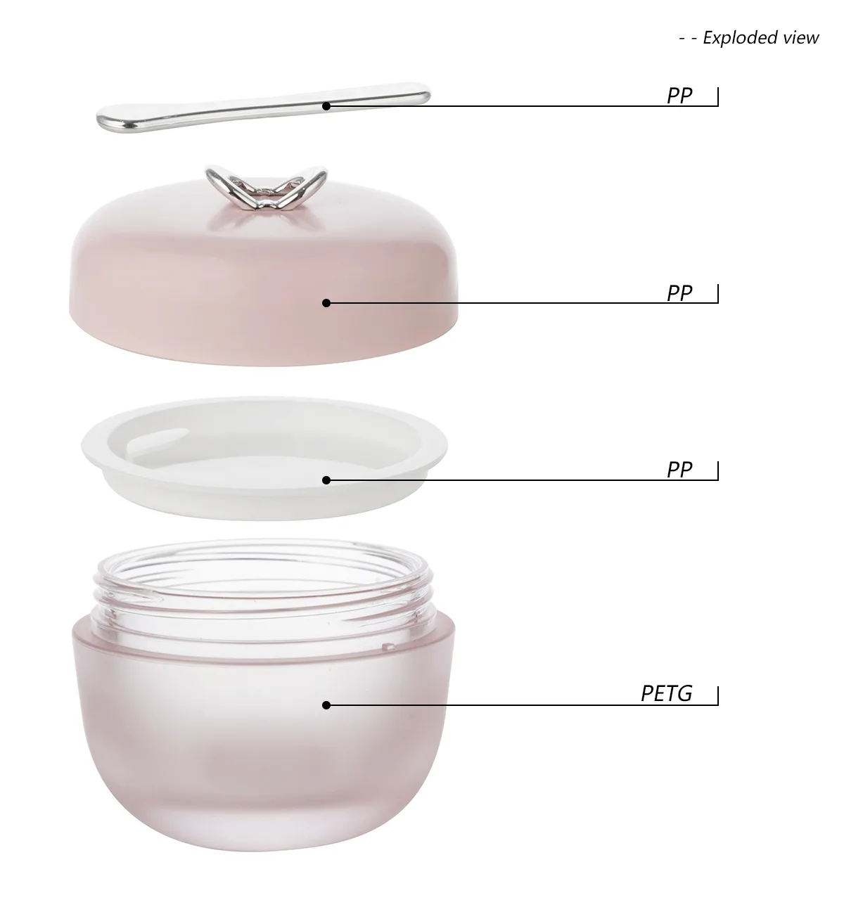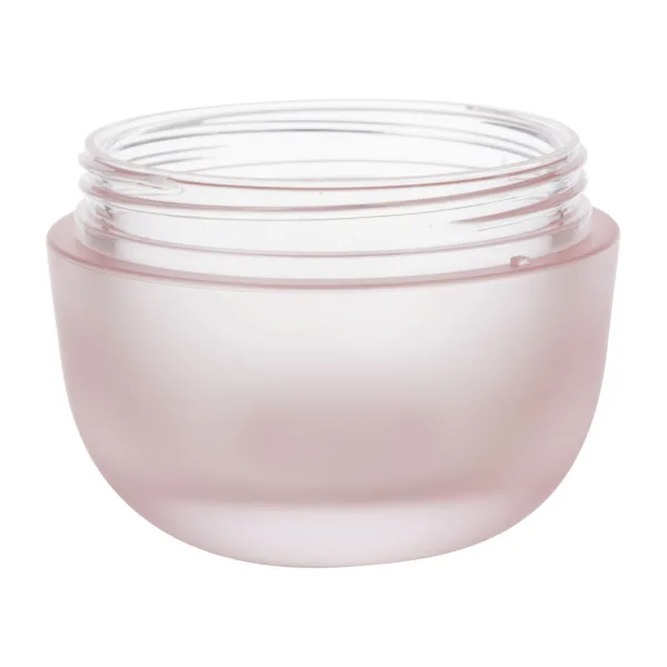 This elegant jar is made for skincare products. It has a soft pink color that shows luxury and sophistication. It is made from high-quality PP and PETG materials, which make it durable and comfortable to hold. The smooth, frosted surface adds visual appeal and protects the contents from light. The jar comes with a spatula for hygienic product use, which reduces bacteria transfer and ensures precise usage while minimizing waste. The jar can also be customized with different printing techniques to show the brand effectively.