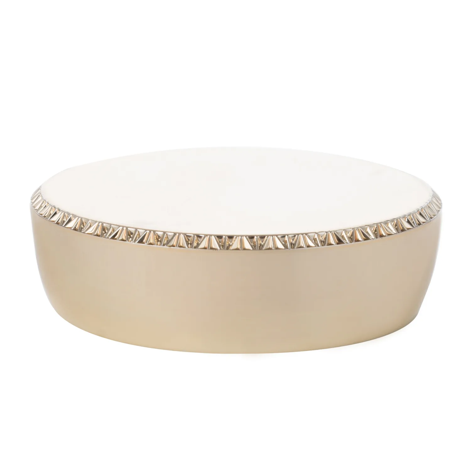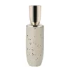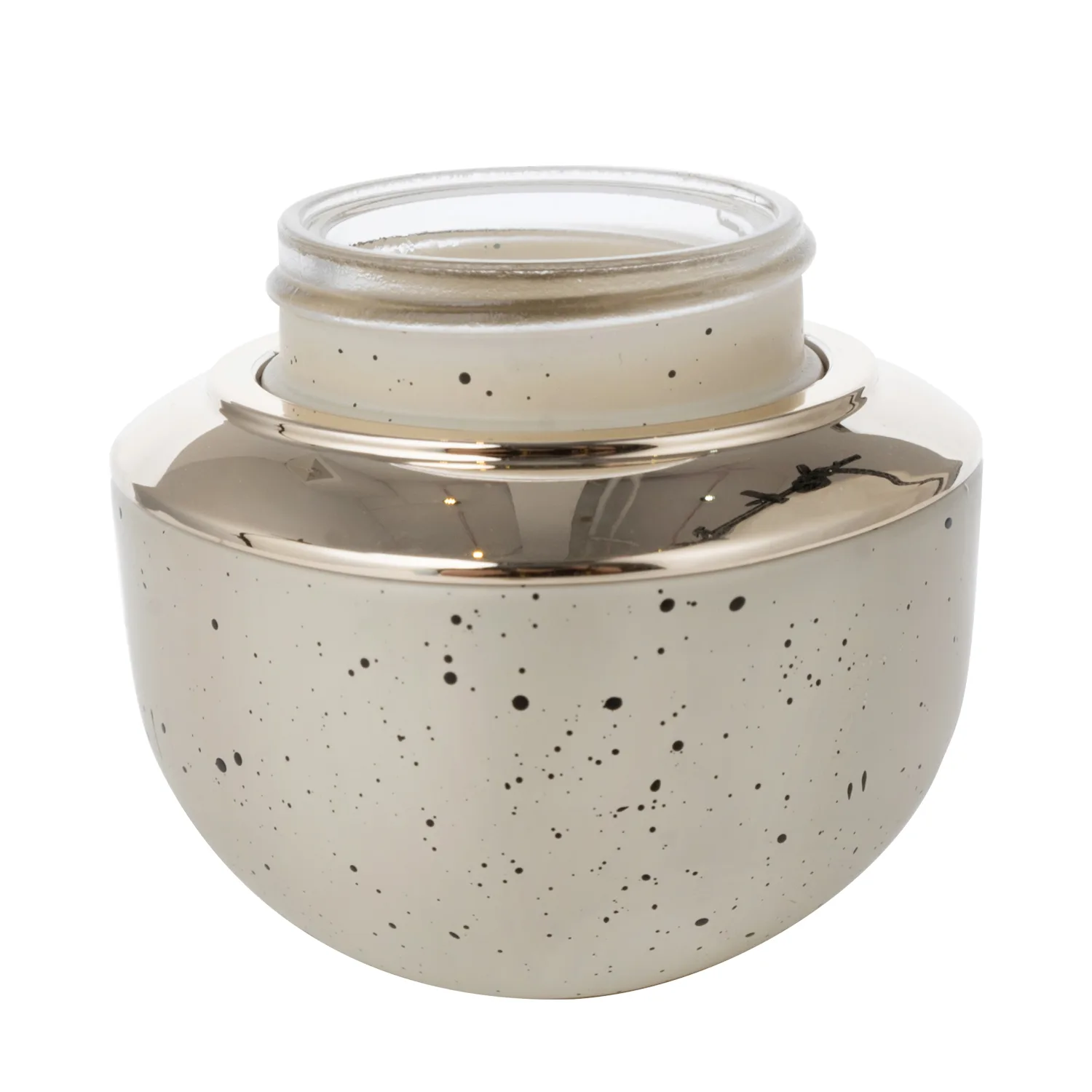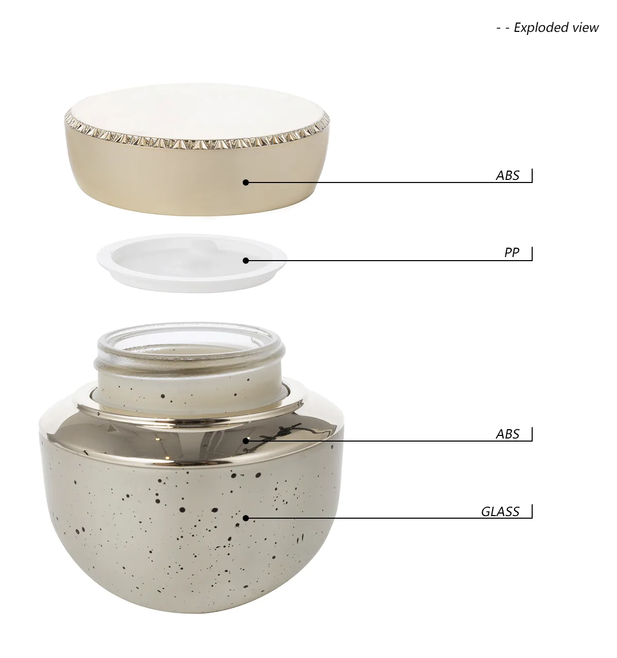 This round glass jar has a unique design and blends style with elegance. The jar is made of high-quality glass. It shows a mixed color tone and splatter effects that make it visually appealing. The smooth gold ABS lid has fine details that improve its look.
