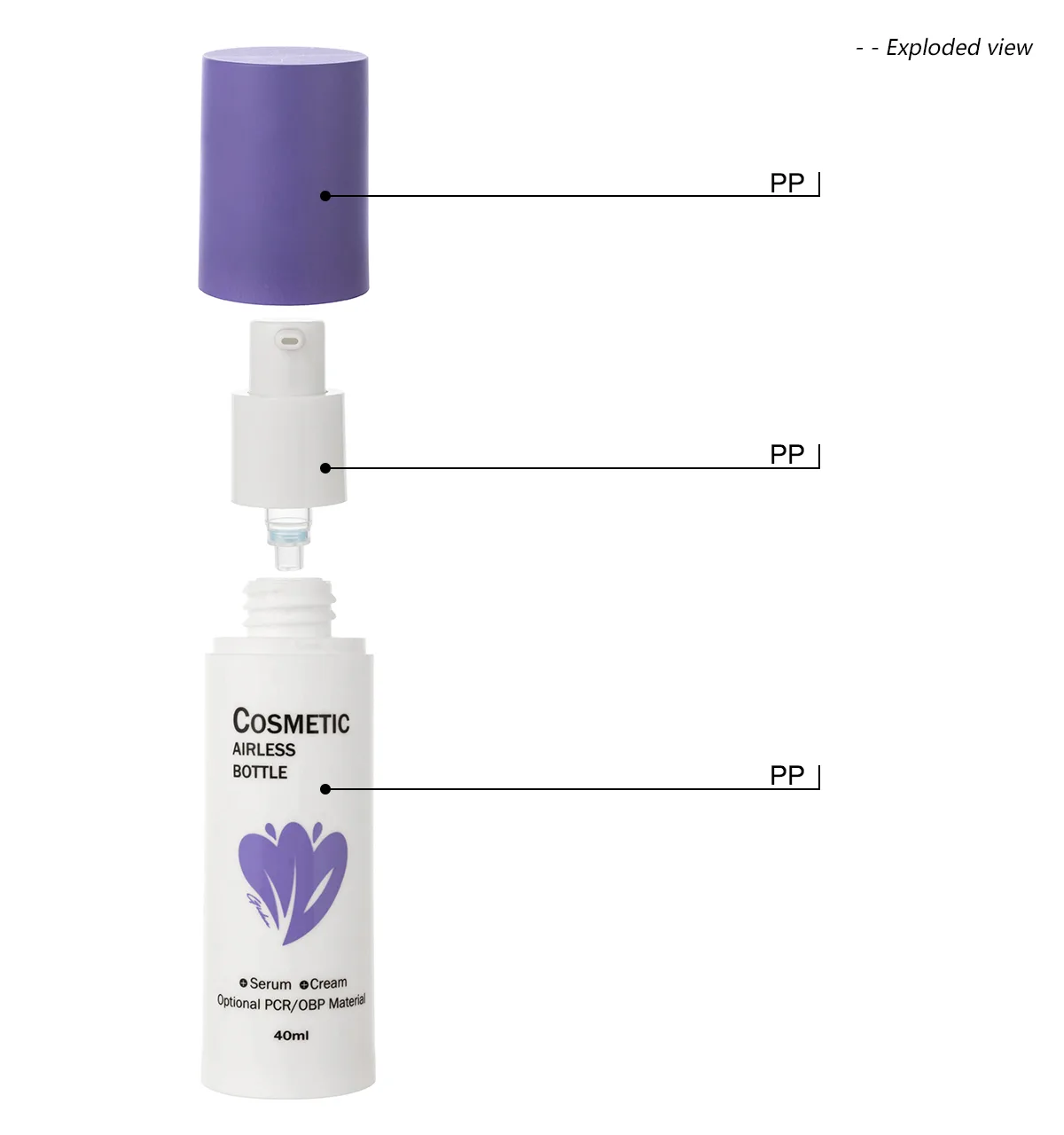 Explore our recyclable PP airless bottle. It comes in 30ml, 40ml, 50ml, 80ml, and 100ml sizes. You can customize it based on your needs. The bottle has an efficient airless pump. It is made for eco-friendly skincare packaging. It uses recyclable materials to reduce environmental impact and support sustainability. The airless design prevents oxidation. This keeps the product fresh and active.