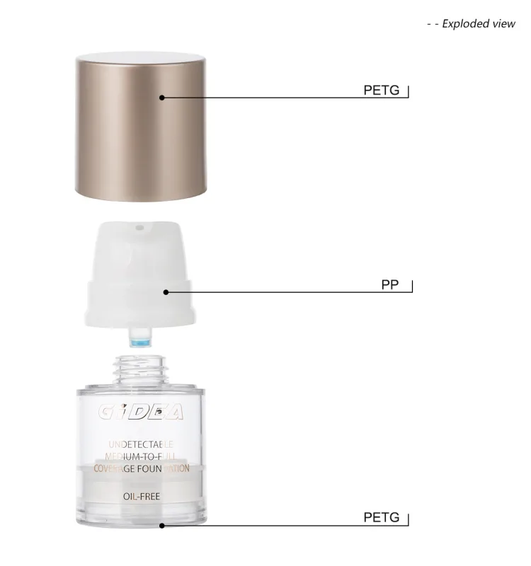The design of this bottle is clever. The cap is made of golden cylindrical PETG, the pump head is white PP, and the bottle body is clear PETG. This packaging protects the product and shows its quality and practicality through simple visual effects.