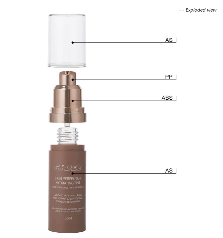 The design of the brown airless bottle focuses on sustainability. It uses eco-friendly materials like AS, PP, and ABS. These materials are recyclable and durable. They reduce environmental impact and carbon footprints. The airless pump design cuts down on product waste. It ensures efficient use. The mix of eco-friendly materials and simple design makes it a good choice for consumers and brands that care about sustainability.